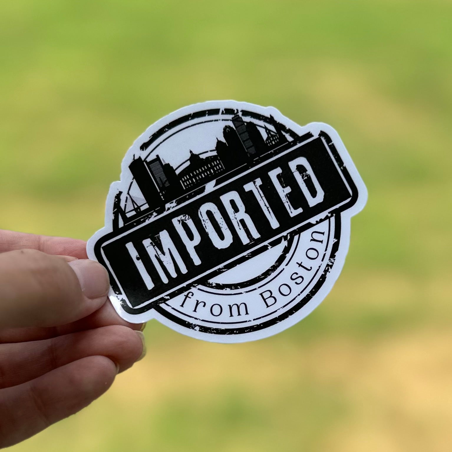 Add some Boston flair to your life with our Imported Sticker from Boston! Made from durable vinyl, these waterproof stickers come in bold red or sleek black, in three sizes. Perfect for decorating water bottles, laptops, and more! (Sorry, Boston accents not included.)